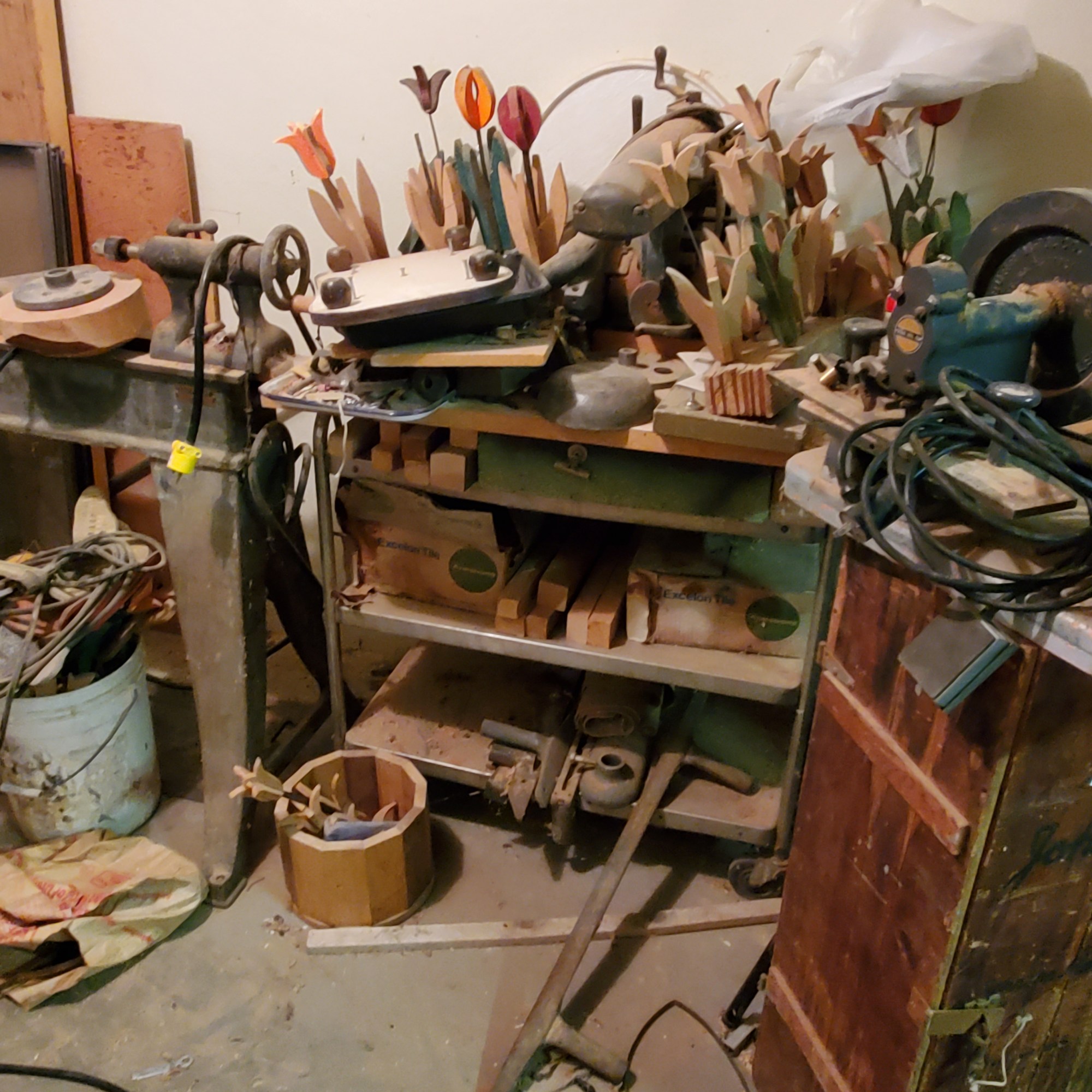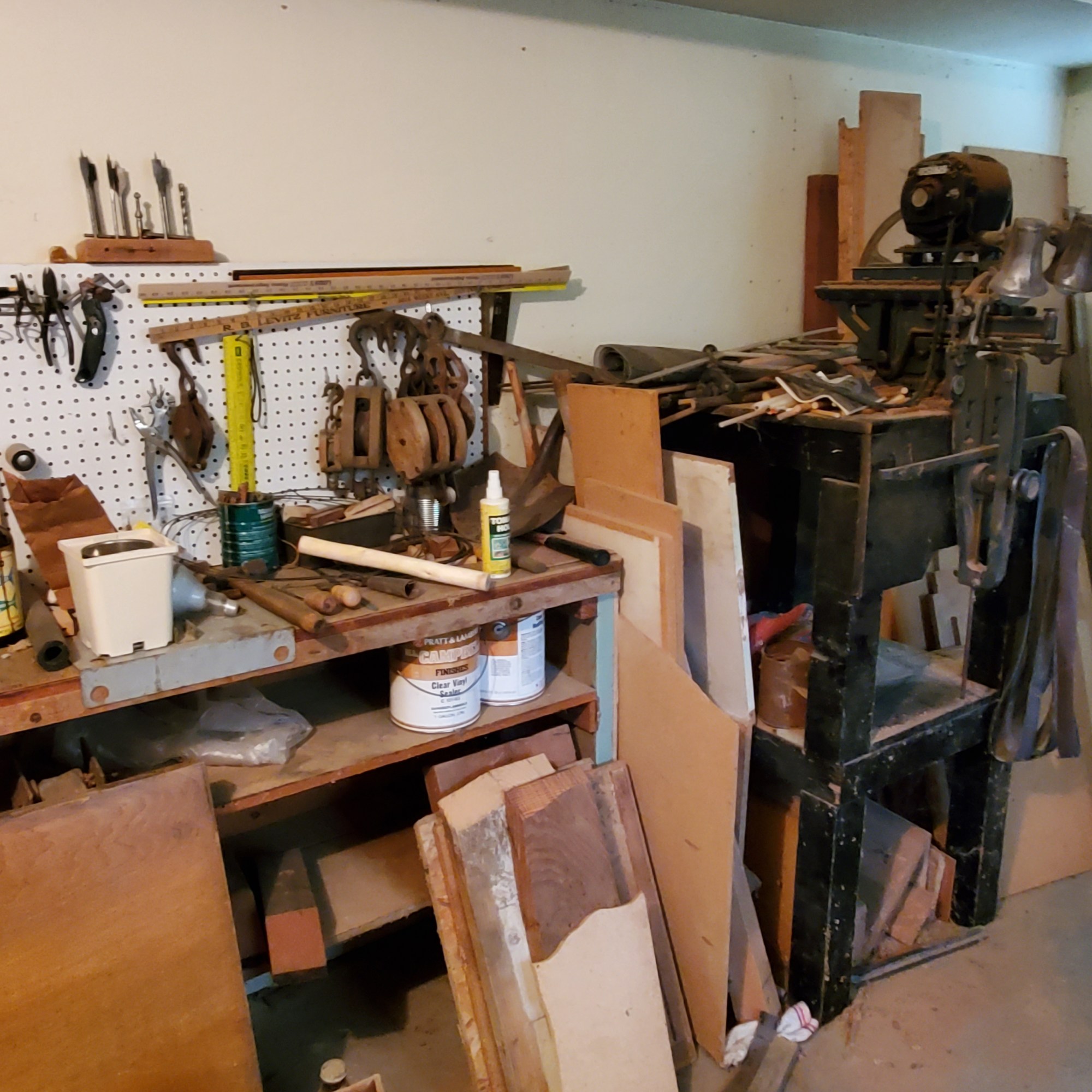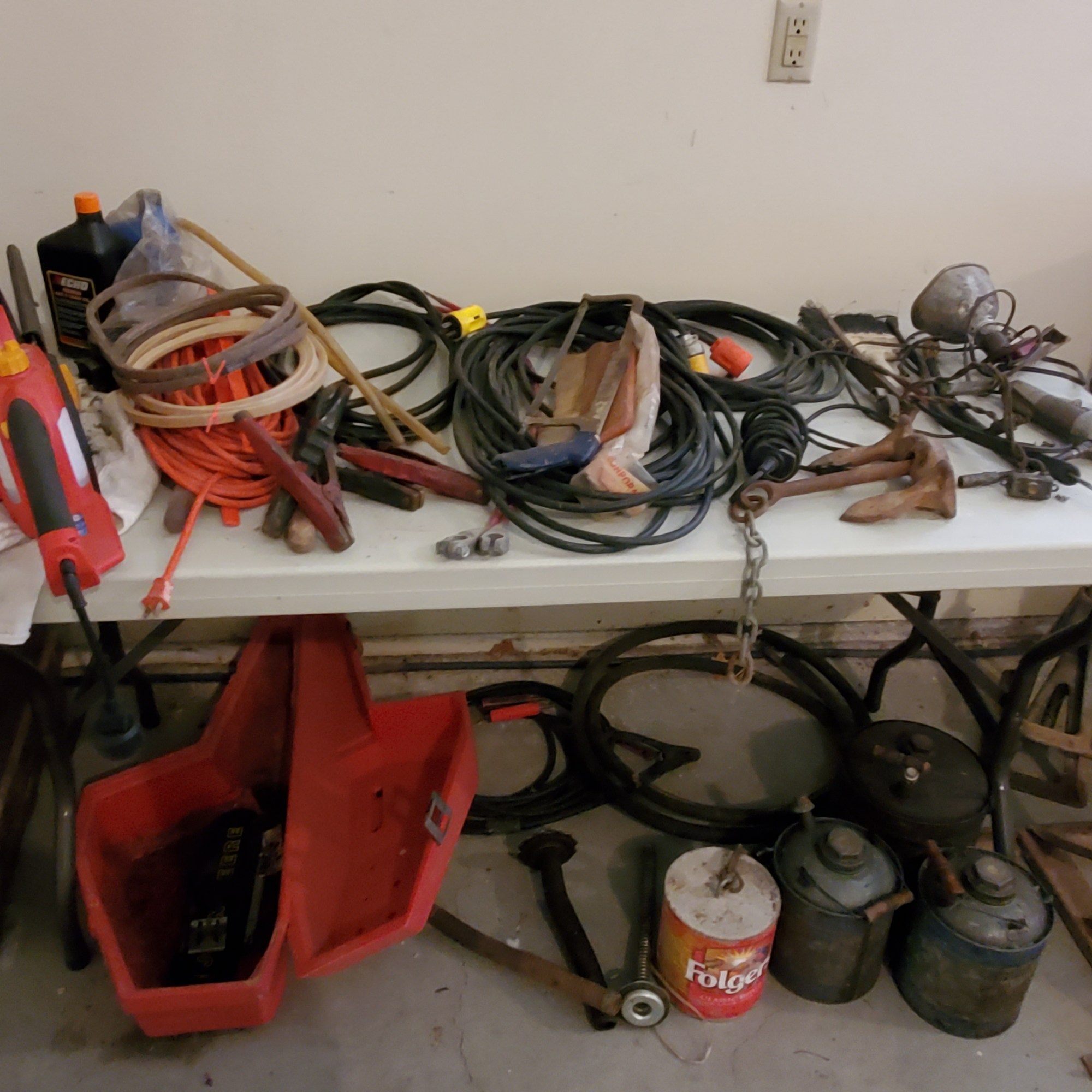 Wood lathe, saw sharpener, antique armature tester, Foley power setter, work benches, hand jig saw, router, hand grinder, antique transit with tripod, book and case, Johnson boat motor, scuba equipment, lots of hand tools, Coleman RAM-X crawdad boat, arc welder, compresser, antique solder torch, work bench with drawers, WWII handgun holster, Peter Wright anvil, lots and lots of tools.