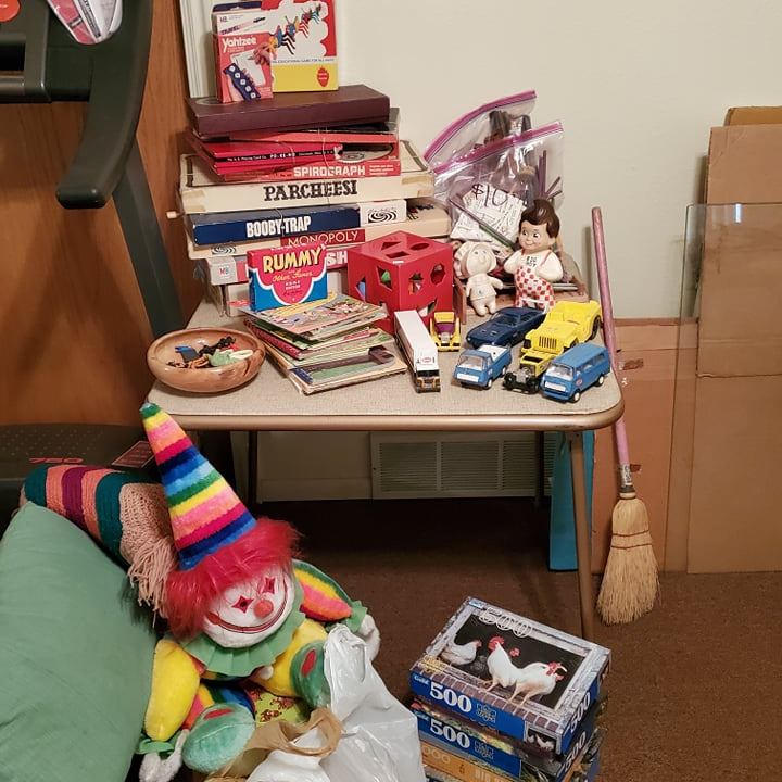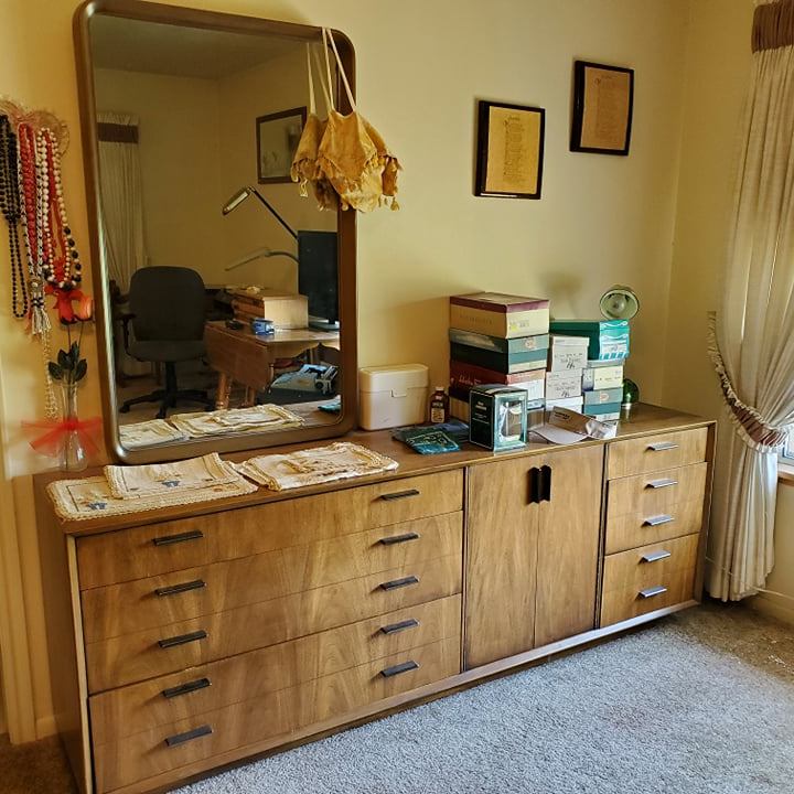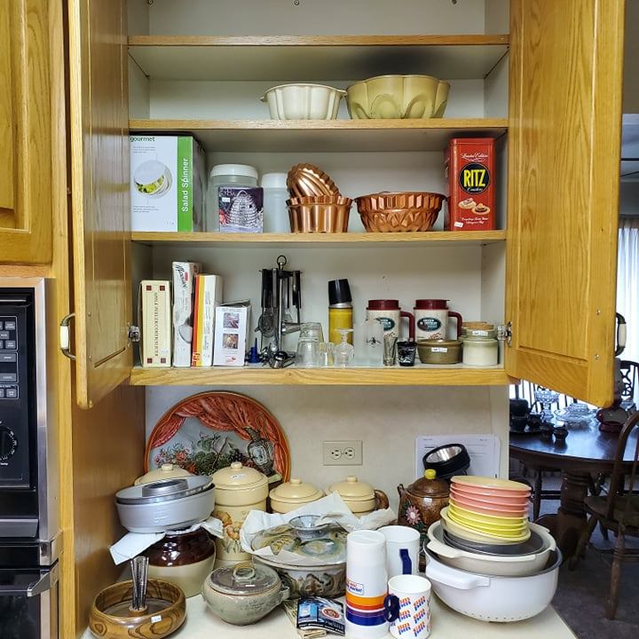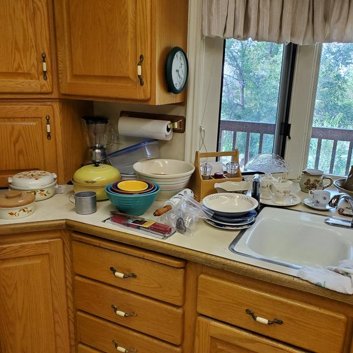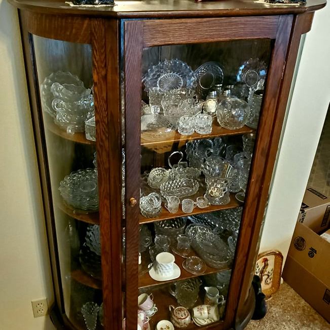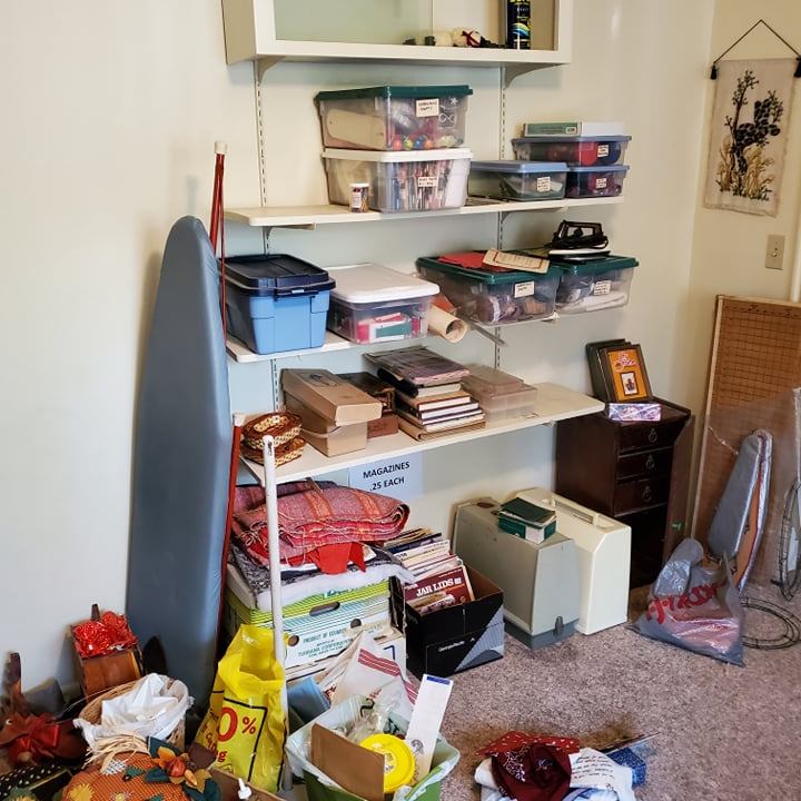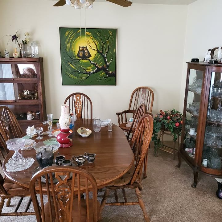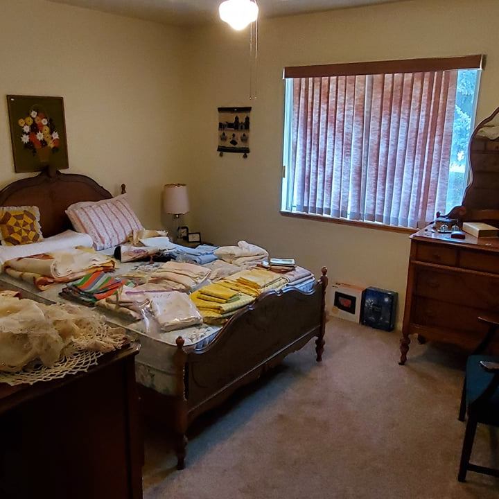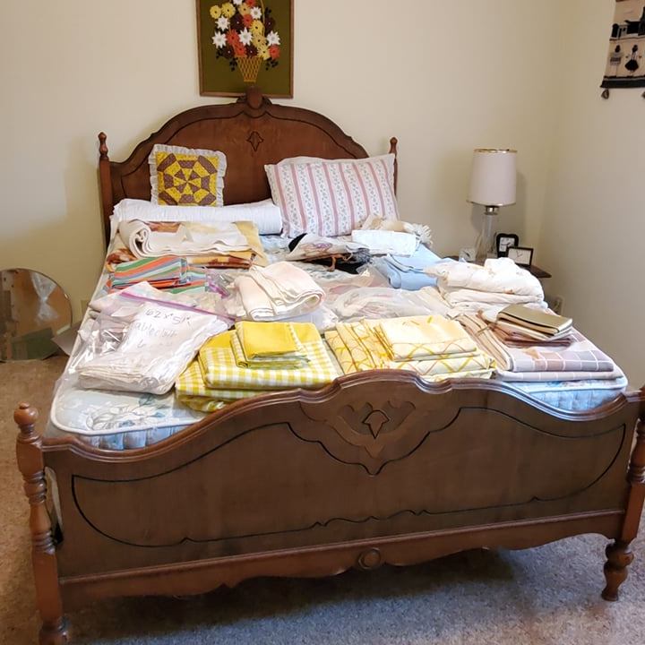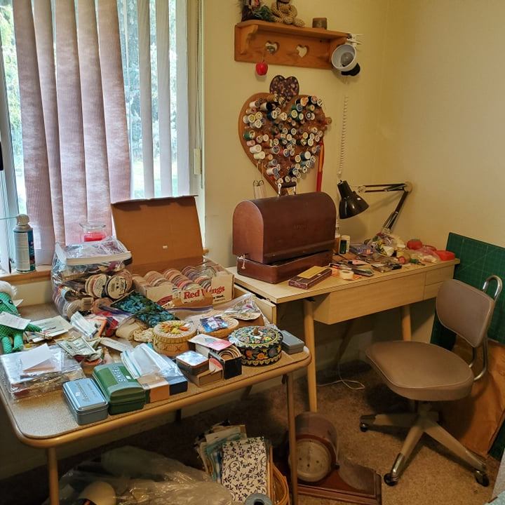 Kitchen full of everyday items, brand new hand towels, Kitchenaid, Cuisinart Food Processor, Wagnerware, revere ware, cast iron, Wilton cake pans, cake decorating items, cook books, collection of Fostoria American Glassware, antique curio cabinet, antique barrister/lawyer bookcase, Lane bedroom set, antique bedroom set with highboy and chest of drawers with mirror, antique roll top desk, lots of antique household items including vintage glassware and depression glass, Hutschenreuther Vernon china, vintage & retro McCall’s sewing patterns, fabric, yarn and knitting items, Vintage cabbage patch doll and homemade clothing, large collection vintage and antique ladies handkerchiefs, Antique Singer sewing machine with bentwood carrying case & key, Singer sewing machines from the 70’s & 80’s, antique White sewing machine in table, antique Singer sewing machine in table, Roos cedar chest, second cedar chest, oak dining table with leaf and chairs, Snooker pool table from the Delmar Hotel in Las Vegas, 2 antique trunks with innards, televisions, full stained glass sheets and so on!!!